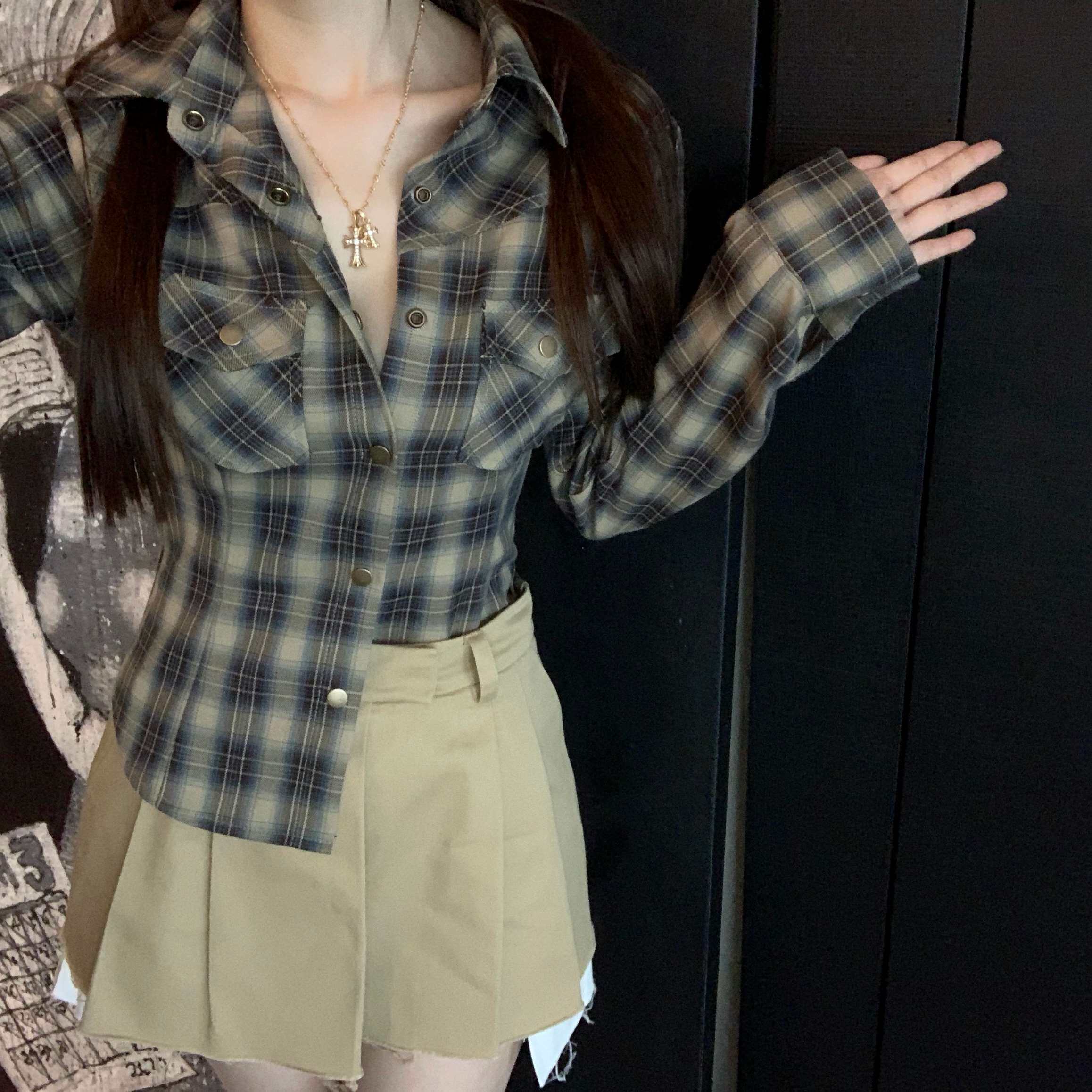 CHICYOU【女团嫩妹】收腰百搭修身格子衬衫早春显瘦设计感上衣女热门设计联盟服务商